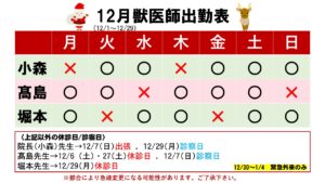 12月獣医師出勤表 2025.11.25 お知らせ外来担当医変更 もうすぐ12月です! 今年も残り1か月となりました。 寒さも厳しくなってまいりました。寒さ対策をしっかりして元気に過ごしましょう! 12月(12/1~12/29)の獣医師出勤表を掲示しておりますのでご確認ください。