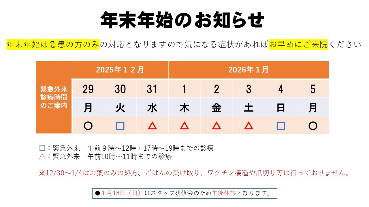 お薬のみの処方、ごはんの受け取り、ワクチン接種や爪切りは行っておりません。