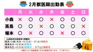 2月獣医師出勤表 2026.01.24 お知らせ外来担当医変更 もうすぐ2月です。 厳しい寒さが毎日続いております。 暖房等を活用し、寒さに負けず体調を崩さないようにしていきましょう。 2月の獣医師出勤表を掲示しておりますのでご確認ください。