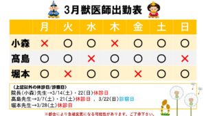 3月獣医師出勤表 2026.02.26 お知らせ外来担当医変更 もうすぐ3月です。 だんだんと暖かくなり、過ごしやすい気候となってきました。 春のお散歩・日向ぼっこを楽しみましょう! 3月の獣医師出勤表を掲示しておりますのでご確認ください。